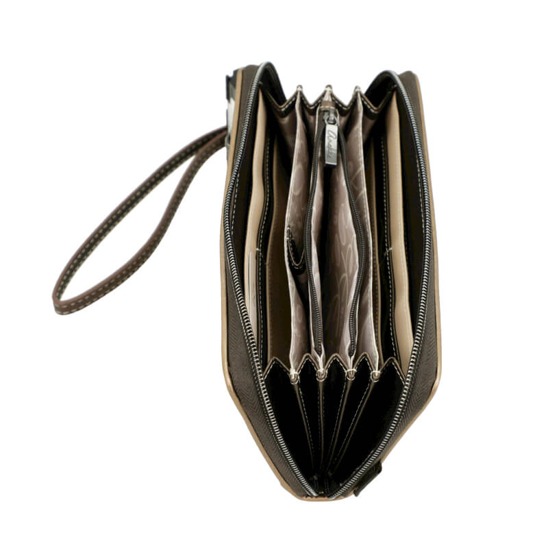 Esta é uma carteira grande. Também poderás usá-la como uma pequena bolsa ou para levar o telemóvel. Este é um modelo muito confortável que abre com zíper, é forrado por dentro e tem uma alça que é incorporada ao puxador do zíper. Possui espaço interno para cartões, documentos e um compartimento com bolso para moedas.