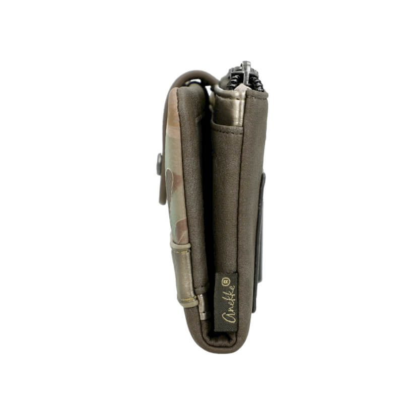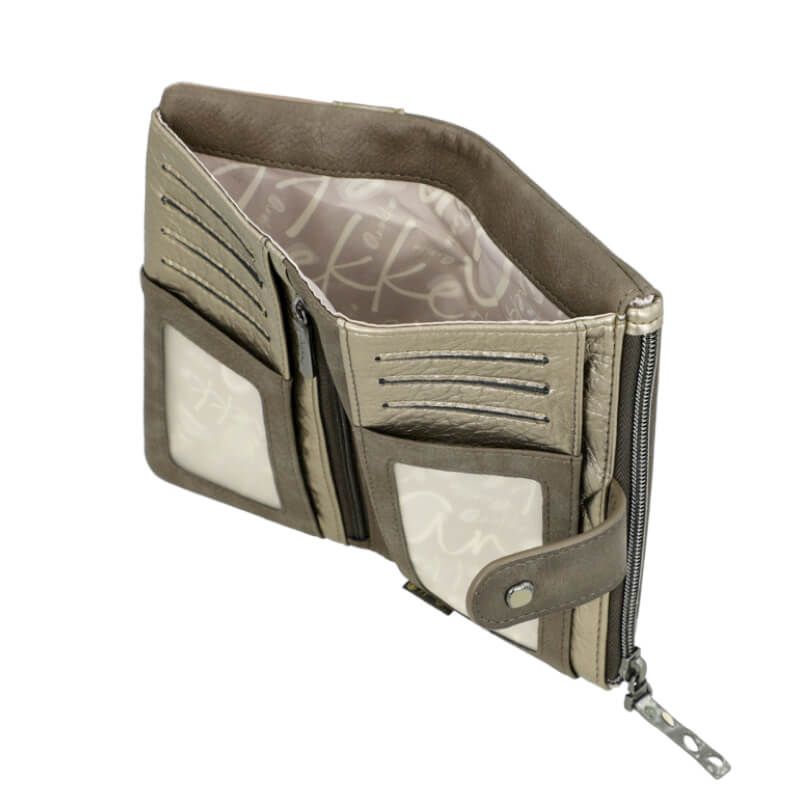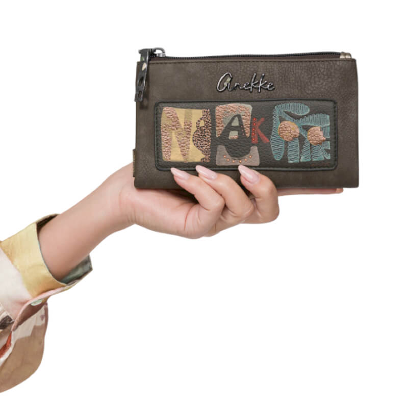 Esta é uma carteira grande. O material com o qual é feita é flexível. Possui dois compartimentos principais: o traseiro, onde encontrarás uma carteira com espaço para notas ou documentos. Na parte superior tem um zíper, e onde podes guardar moedas. Todo o interior é forrado.