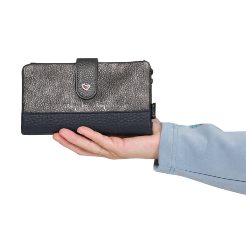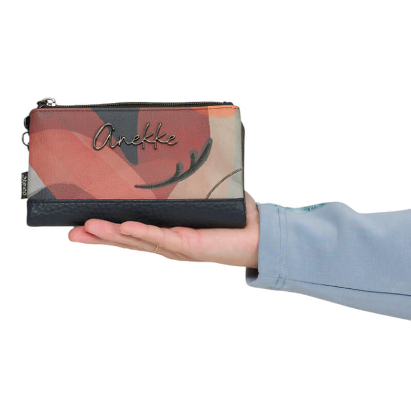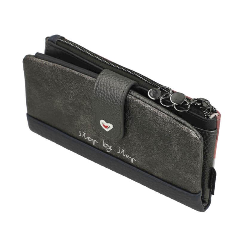 Esta é uma carteira grande. O material com o qual é feita é flexível. Possui dois compartimentos principais: o traseiro, onde encontrarás uma carteira com espaço para notas ou documentos. Na parte superior tem um zíper, e onde podes guardar moedas. Todo o interior é forrado.