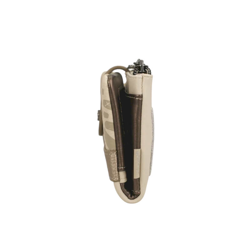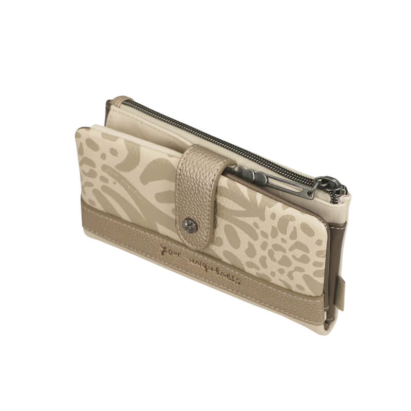 Esta é uma carteira grande. O material com o qual é feita é flexível. Possui dois compartimentos principais: o traseiro, onde encontrarás uma carteira com espaço para notas ou documentos. Na parte superior tem um zíper, e onde podes guardar moedas. Todo o interior é forrado.