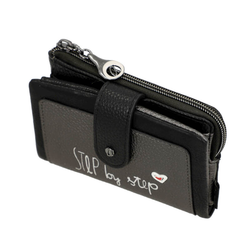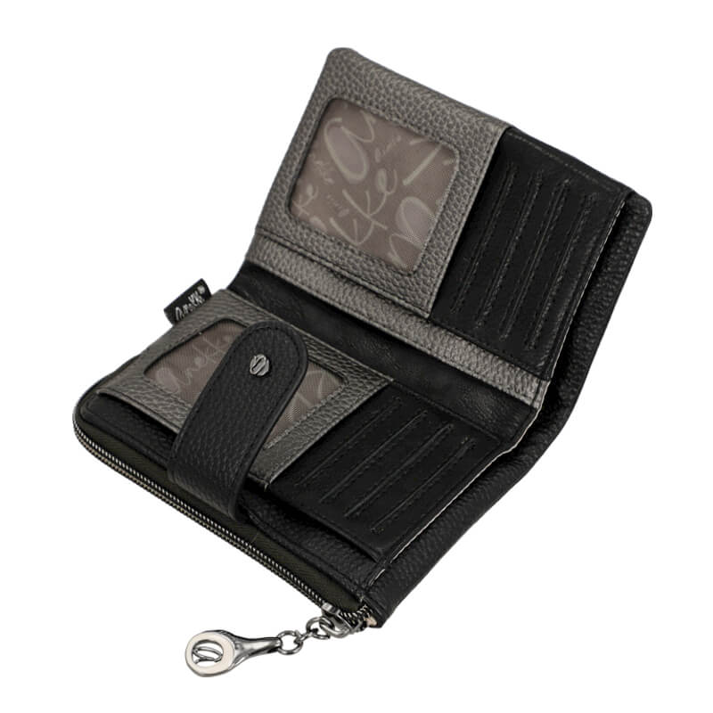 Esta é uma carteira de tamanho médio. O material com o qual é feita é flexível e tem dois compartimentos principais: o traseiro, onde encontrarás uma carteira com grande espaço para notas e/ou cartões. Na parte superior possui zíper, e onde podes guardar moedas. Todo o interior é forrado.