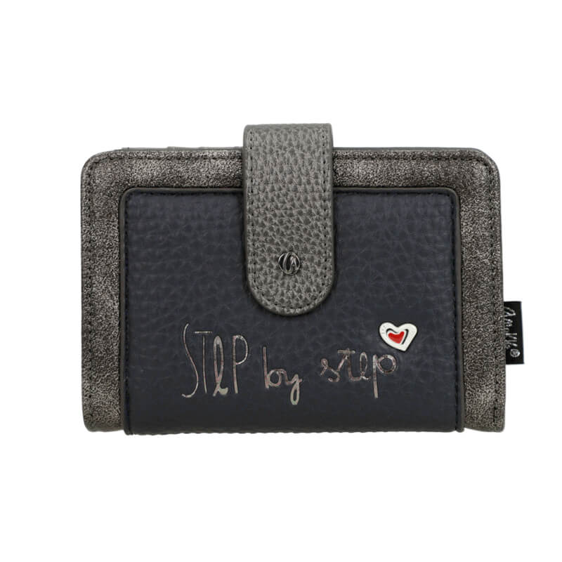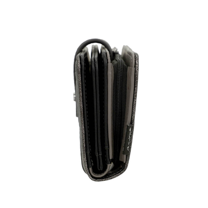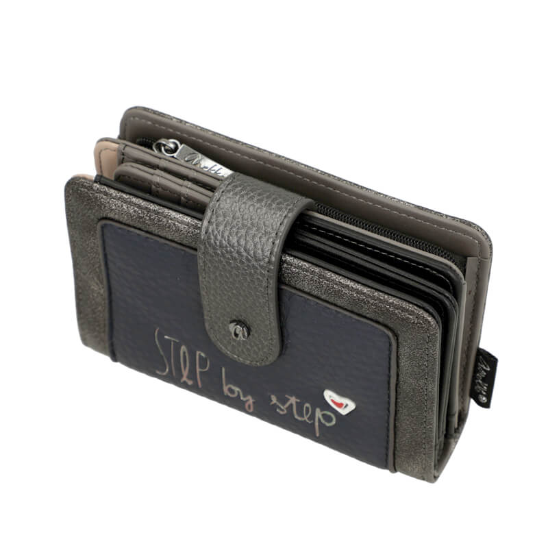 Esta é uma carteira de tamanho médio. Possui dois compartimentos principais: o traseiro, onde encontrarás uma carteira grande e espaço para notas ou documentos. Na parte superior tem um zíper, onde podes guardar moedas. Todo o interior é forrado.
