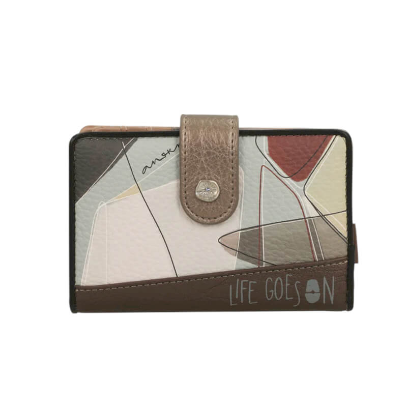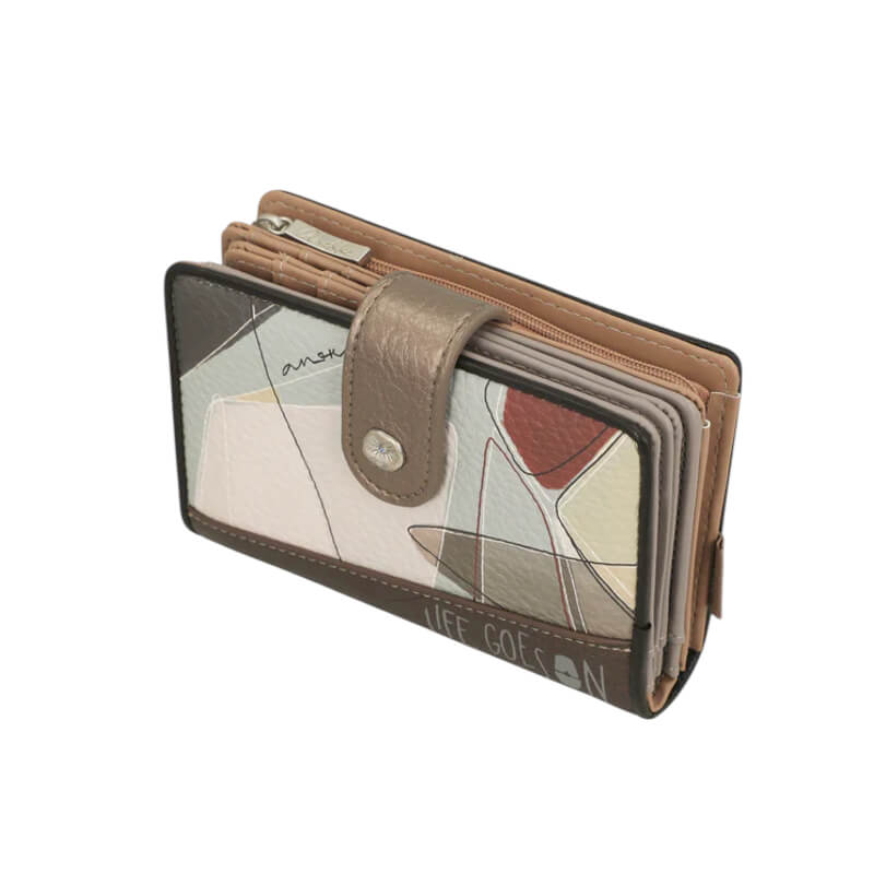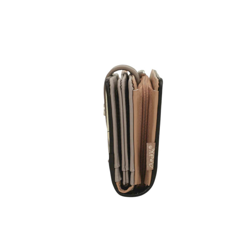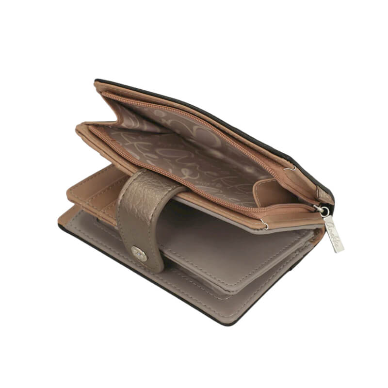 Esta é uma carteira de tamanho médio. Possui dois compartimentos principais: o traseiro, onde encontrarás uma carteira grande e espaço para notas ou documentos. Na parte superior tem um zíper, onde podes guardar moedas. Todo o interior é forrado.