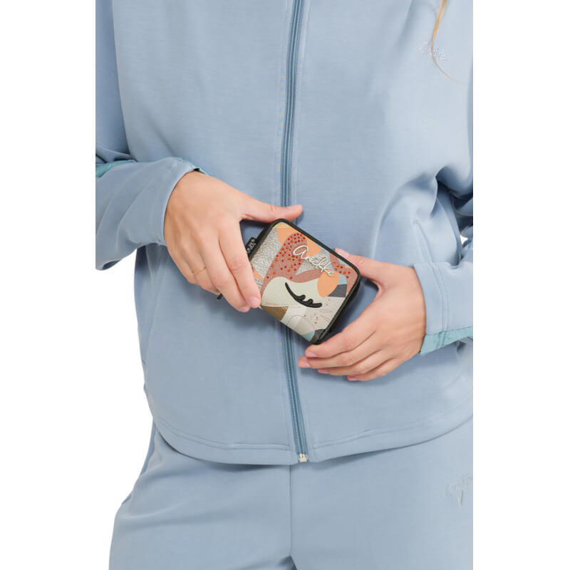 Esta é uma carteira de tamanho pequeno. Ela possui dois compartimentos principais: um na parte de trás, onde encontrarás uma carteira grande e com espaço para notas ou documentos, e um compartimento na parte superior que possui um fecho de correr, e dentro pode guardar moedas. Todo o interior é forrado.