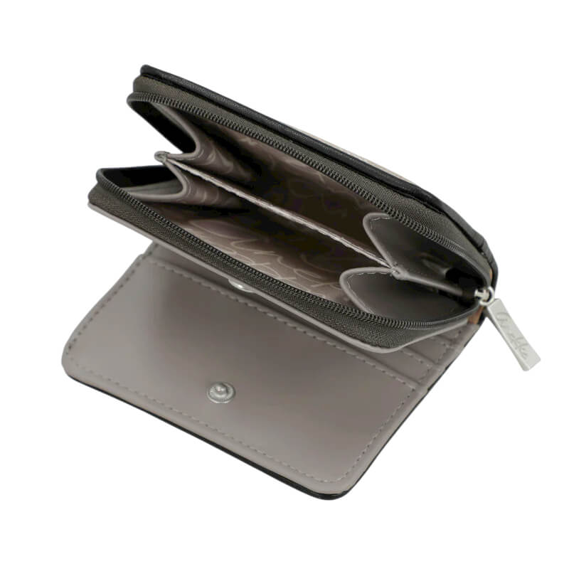 Esta é uma carteira de tamanho pequeno. Ela possui dois compartimentos principais: um na parte de trás, onde encontrarás uma carteira grande e com espaço para notas ou documentos, e um compartimento na parte superior que possui um fecho de correr, e dentro pode guardar moedas. Todo o interior é forrado.