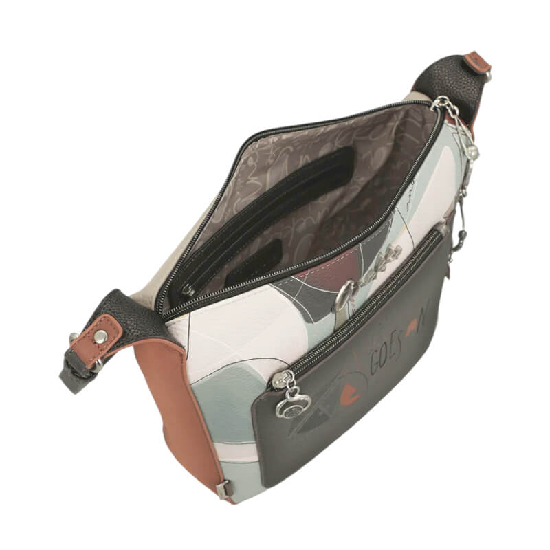 Esta mala de tiracolo grande abre com um zíper na parte superior. Possui interior amplo forrado e bolsos no seu interior, além de um bolso externo nas costas e na parte frontal. A alça de ombro é ajustável a diferentes comprimentos.
