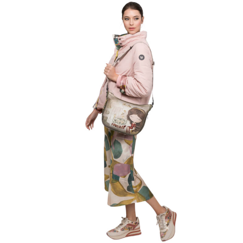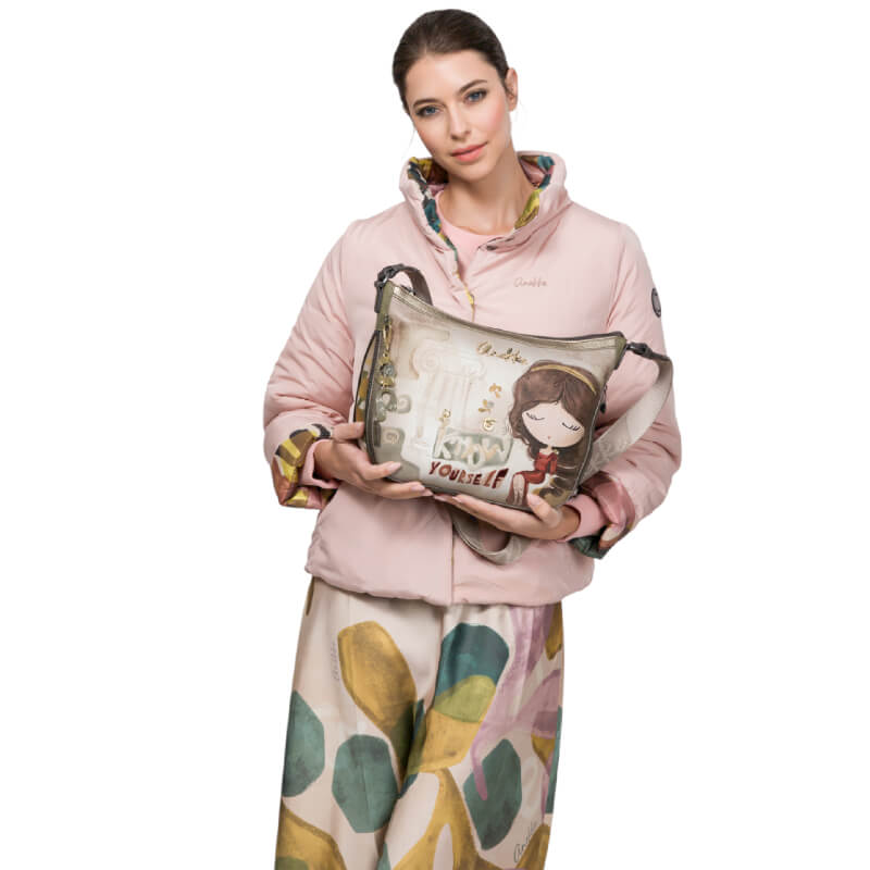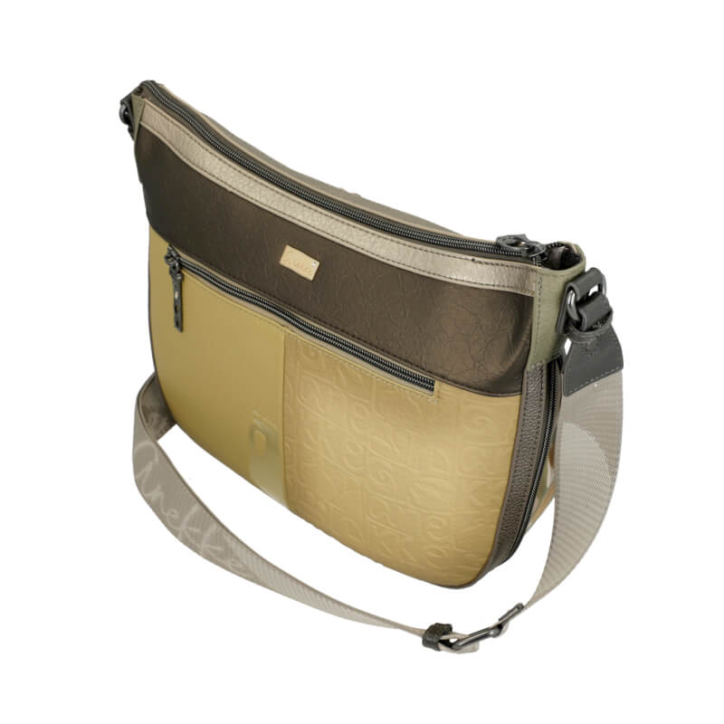 Esta mala de tiracolo grande abre com um zíper na parte superior. Possui interior amplo forrado e bolsos no seu interior, além de um bolso externo nas costas. Um dos toques mais especiais desta mala de tiracolo é que ela possui um zíper que percorre toda a lateral na parte inferior, permitindo que a abras para aumentar a mala se precisares. A alça de ombro é ajustável a diferentes comprimentos.