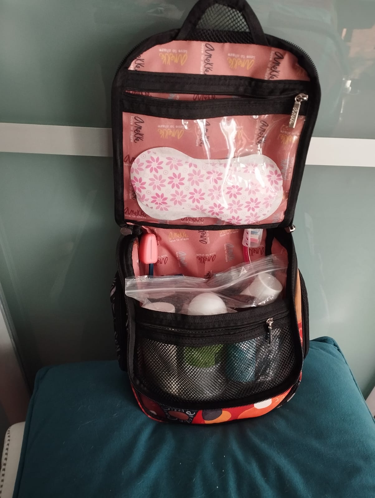 Este é um necessaire composto por um compartimento principal espaçoso e com bolsos para puder organizar comodamente os seus produtos de higiene e cosméticos. O interior da bolsa inclui um cabide de suporte para que possa pendurá-lo.