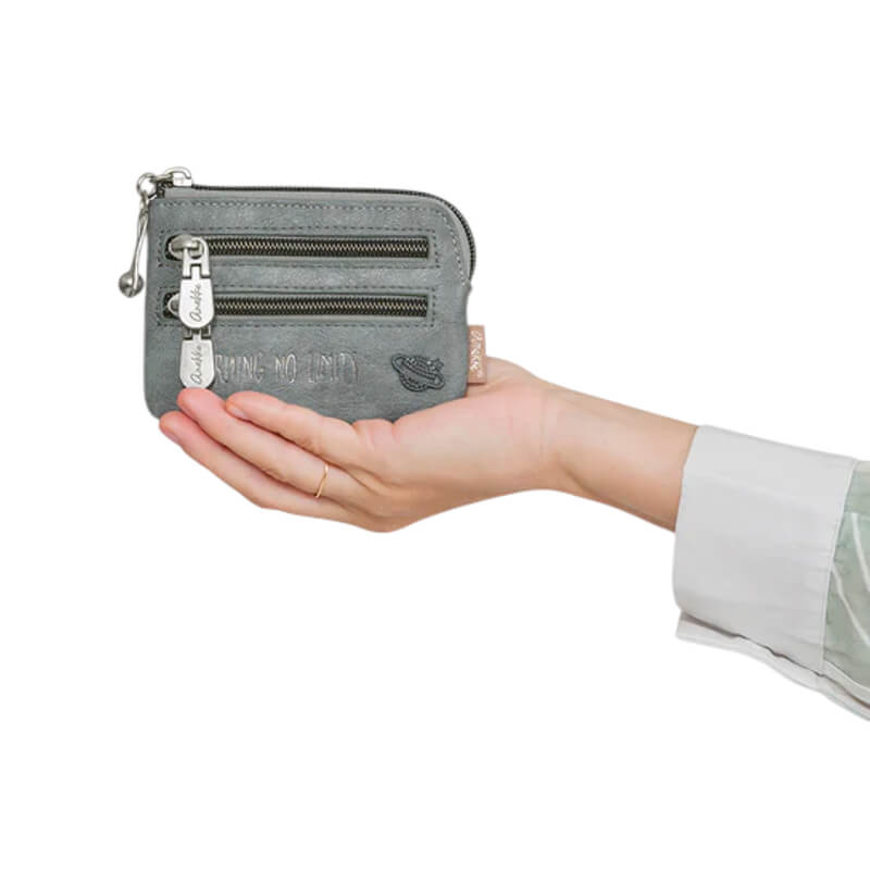 Este porta-moedas pequeno é perfeito para transportar em bolsas pequenas ou quando só precisas de carregar o essencial. Abre com um fecho zíper e possui forro interno, além de dois bolsos traseiros, ambos com fecho em zíper.