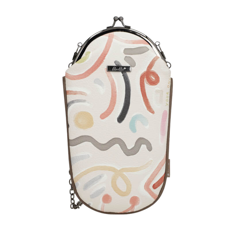 Este estojo original para óculos com fecho de boquilla é de tamanho médio-pequeno e permite-te utilizá-lo tanto para guardar os teus óculos como para usá-la como uma pequena bolsa de ombro onde podes transportar o teu telemóvel. Possui um toque vintage original, graças ao fecho da boquilha e alça de corrente de metal, e interior forrado.