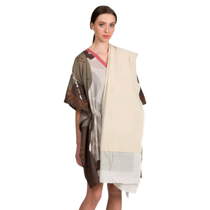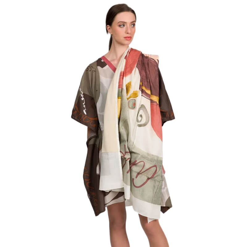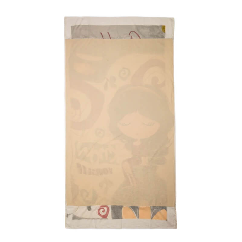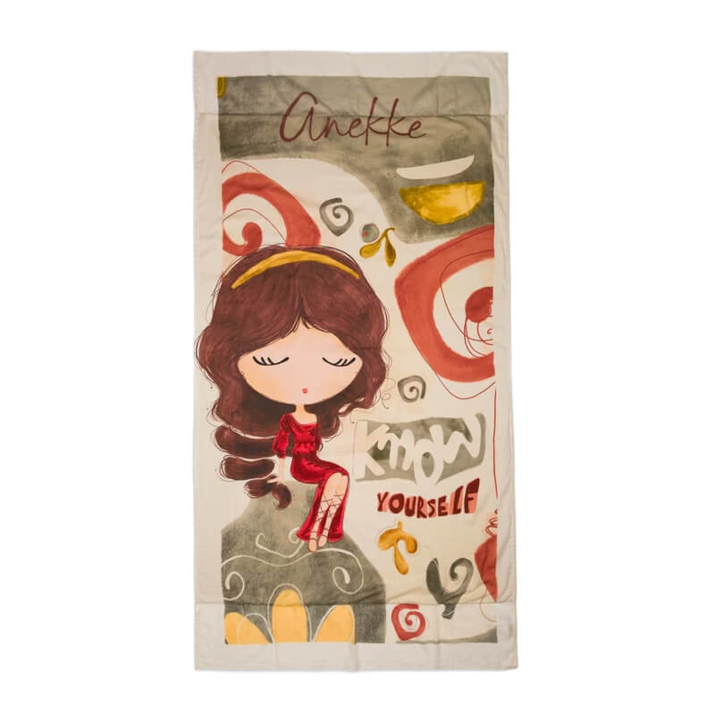 A toalha de praia da Anekke reflete uma elegância clássica com um toque artístico e feminino. Inspirada na coleção Muse, apresenta na frente uma ilustração delicada de uma personagem com vestido vermelho, sentada de forma graciosa, com olhos fechados e expressão serena. O fundo combina tons neutros como bege e cinza com apontamentos em vermelho e dourado, criando um contraste sofisticado e harmonioso.