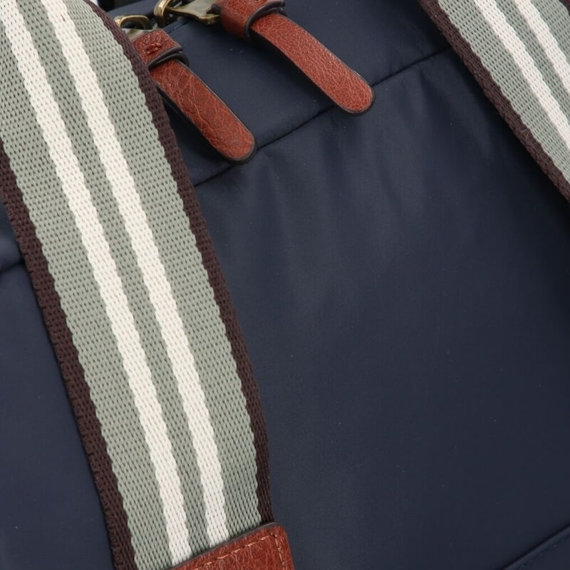 Apresenta um design moderno em tom azul escuro, feita em material resistente e leve, com detalhes em pele castanha que lhe conferem um toque sofisticado. As alças ajustáveis em tecido às riscas, bem como duas pegas superiores reforçadas, garantem conforto e versatilidade no transporte.