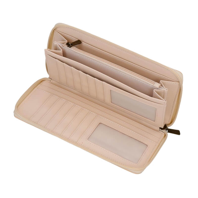 As carteiras seguem a mesma identidade visual, combinando o padrão texturizado frontal com acabamentos suaves. Compactas e organizadas, incluem divisórias práticas para cartões, notas e moedas, mantendo a coerência estética da linha e funcionando como o complemento ideal das bolsas.