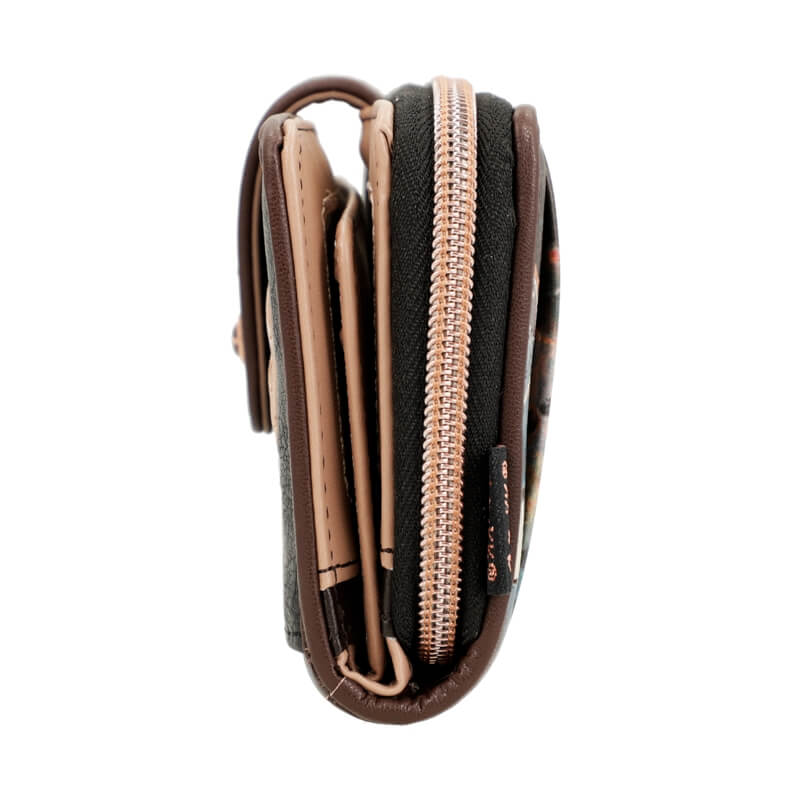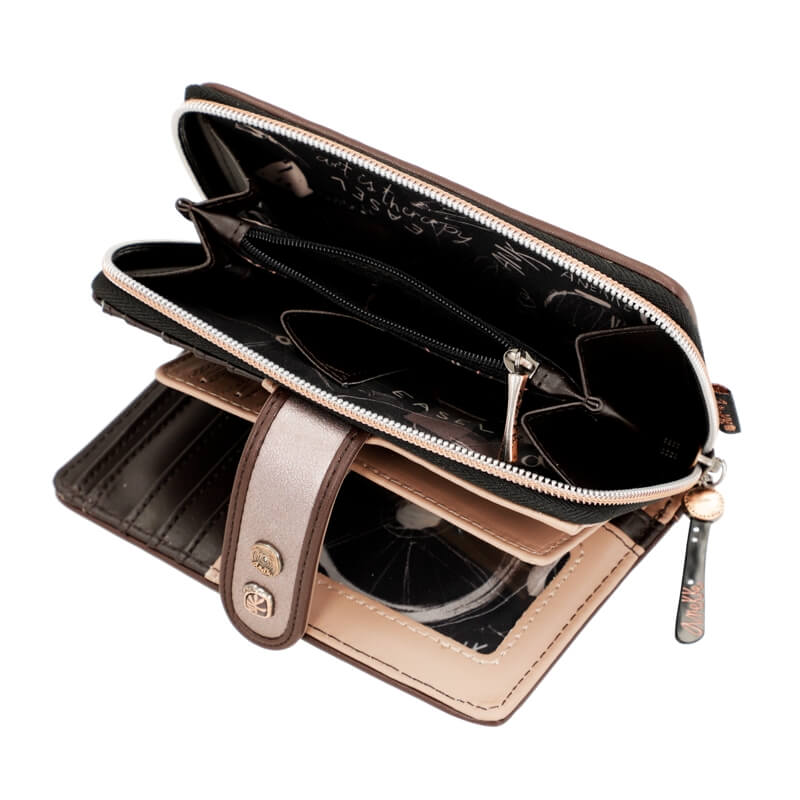 É uma carteira de tamanho médio. tem dois compartimentos principais: o traseiro, onde encontrarás uma carteira grande e espaço para notas e/ou cartões. Na parte superior possui zíper, e no interior podes guardar as moedas. Todo o interior é forrado.