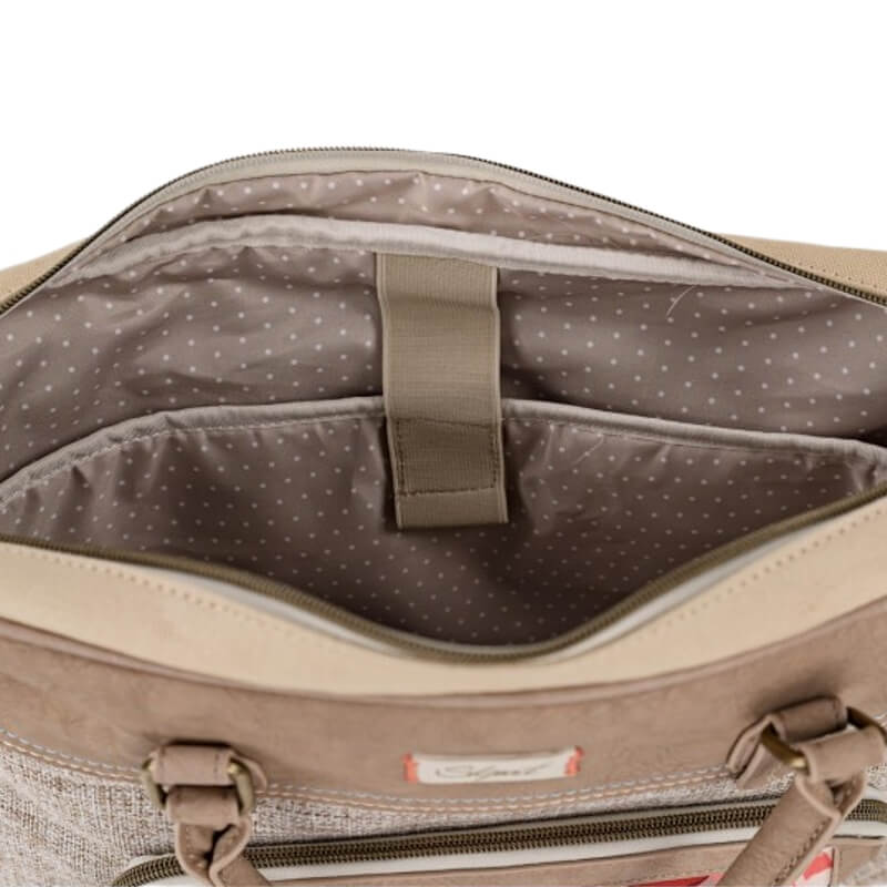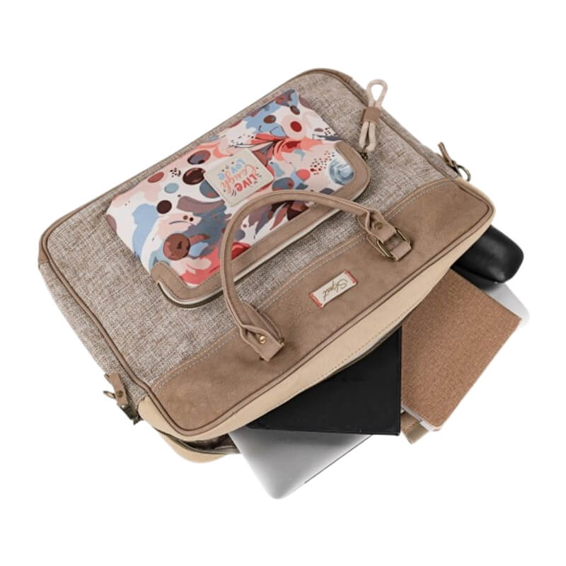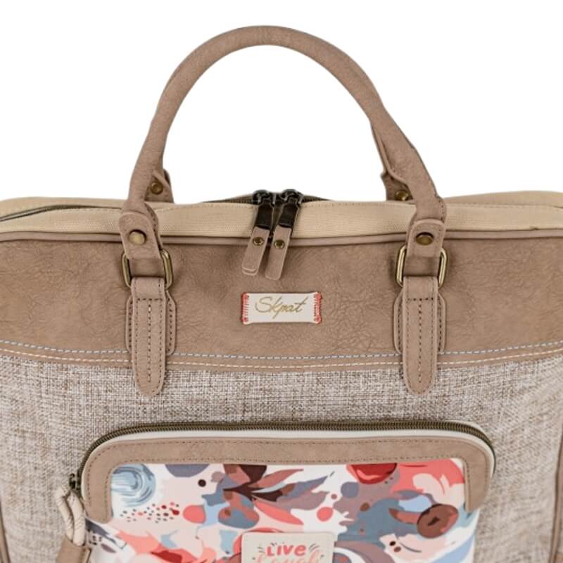 A nova pasta para portátil feminina da coleção Leyre da SKPAT foi concebida para combinar elegância e funcionalidade. Perfeita para transportar computadores portáteis, tablets e documentos com todo o conforto. Apresenta um acabamento em tom bege/taupe, com detalhes em tecido texturado na parte frontal e um painel inferior com estampado artístico multicolor, que lhe confere um toque jovem e original