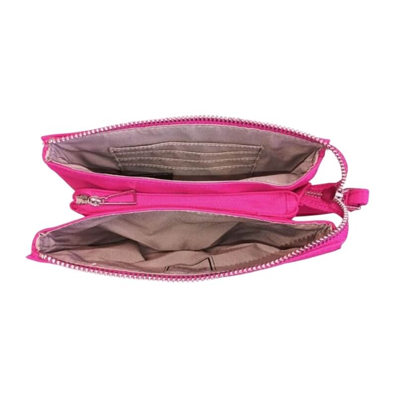 O interior espaçoso conta com três compartimentos diferenciados, pensados para uma organização prática e eficiente. O forro suave em tom claro facilita a visualização dos seus pertences, permitindo guardar maquilhagem, cartões e outros pequenos objetos indispensáveis de forma segura e acessível. O fecho de correr robusto garante proteção adicional e maior durabilidade no uso diário.
