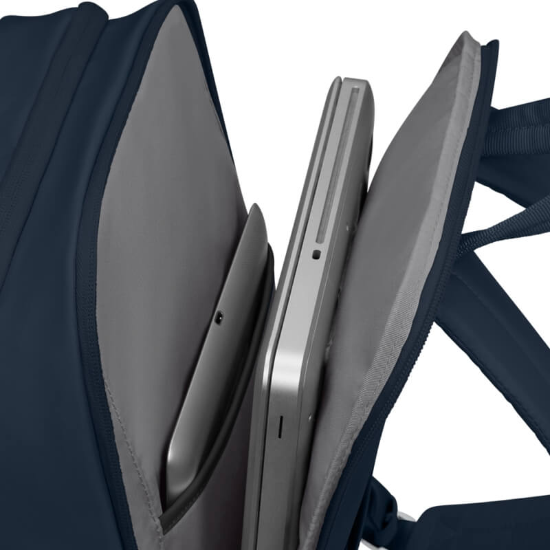 O compartimento principal inclui um bolso acolchoado para portátil até 14.1", garantindo proteção e segurança durante o transporte, além de espaço adicional para documentos e objetos pessoais. No exterior, dispõe de bolsos funcionais de fácil acesso, ideais para manter os essenciais sempre à mão.